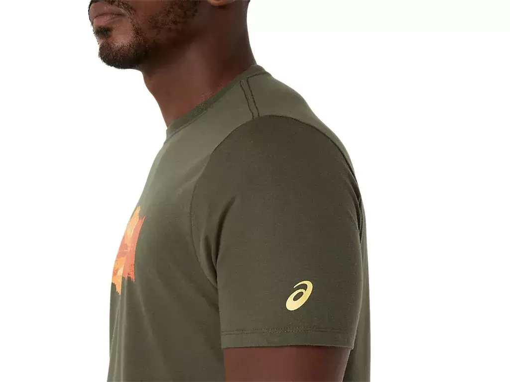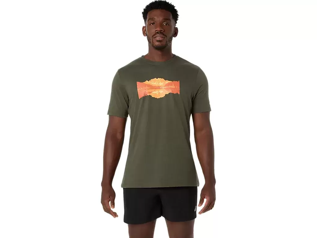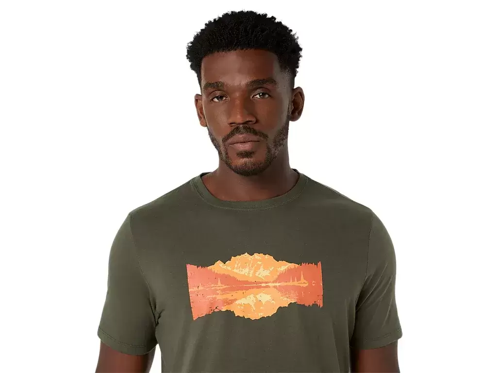 This comfortable knit short sleeve tee takes inspiration from the outdoors. The front graphic features a design of a serene lake with mountain peaks in the distance.
