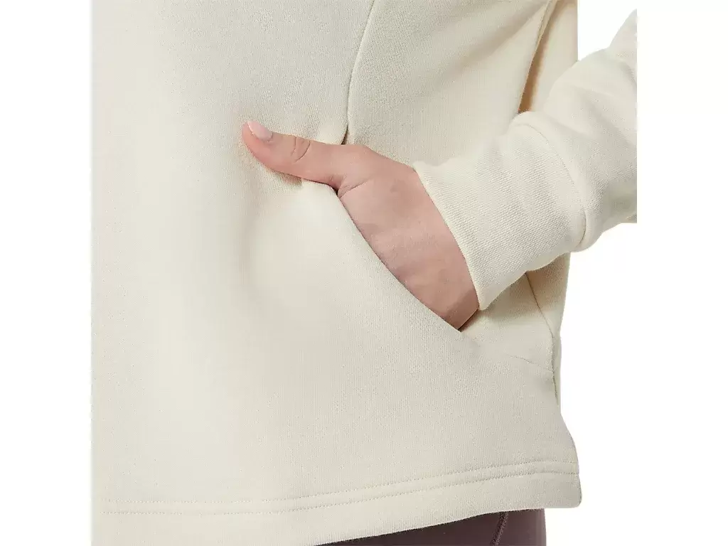 It features a relax silhouette, short length design for a stylish look, and a kangaroo pouch pocket in the front. It also includes an elastic cord at the neck for an adjustable fit keeping you warm.