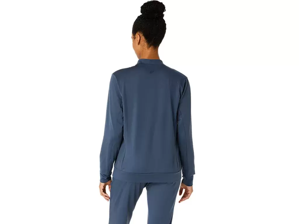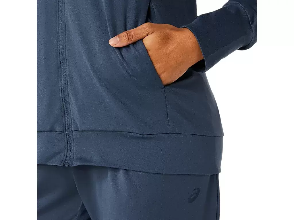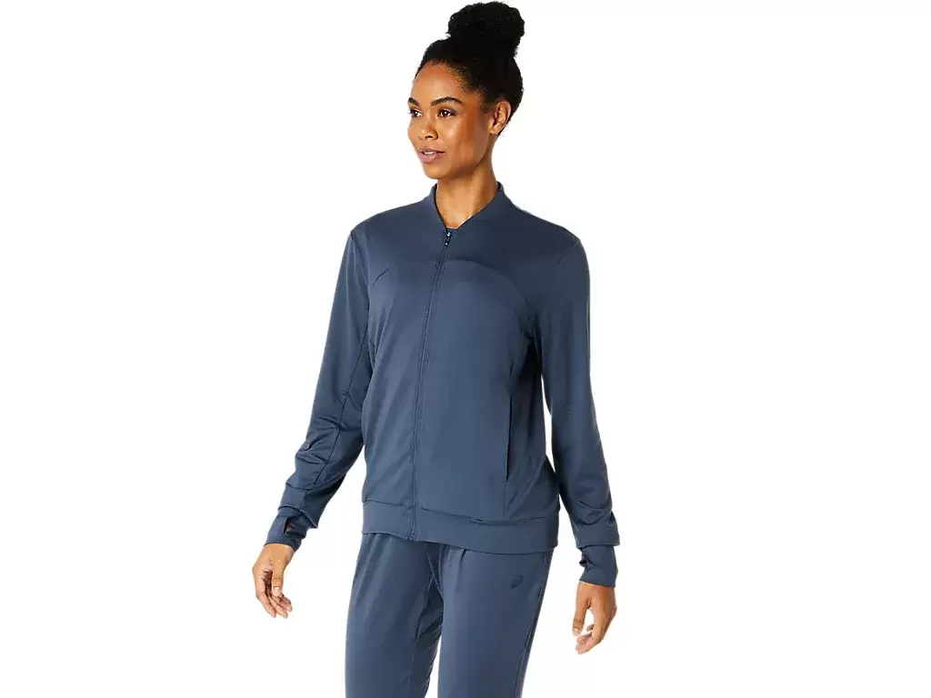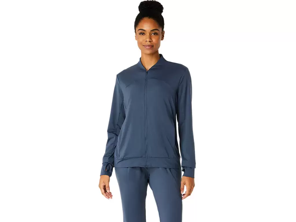 This jacket features a soft, stretchy knit fabric that’s comfortable for various activities.